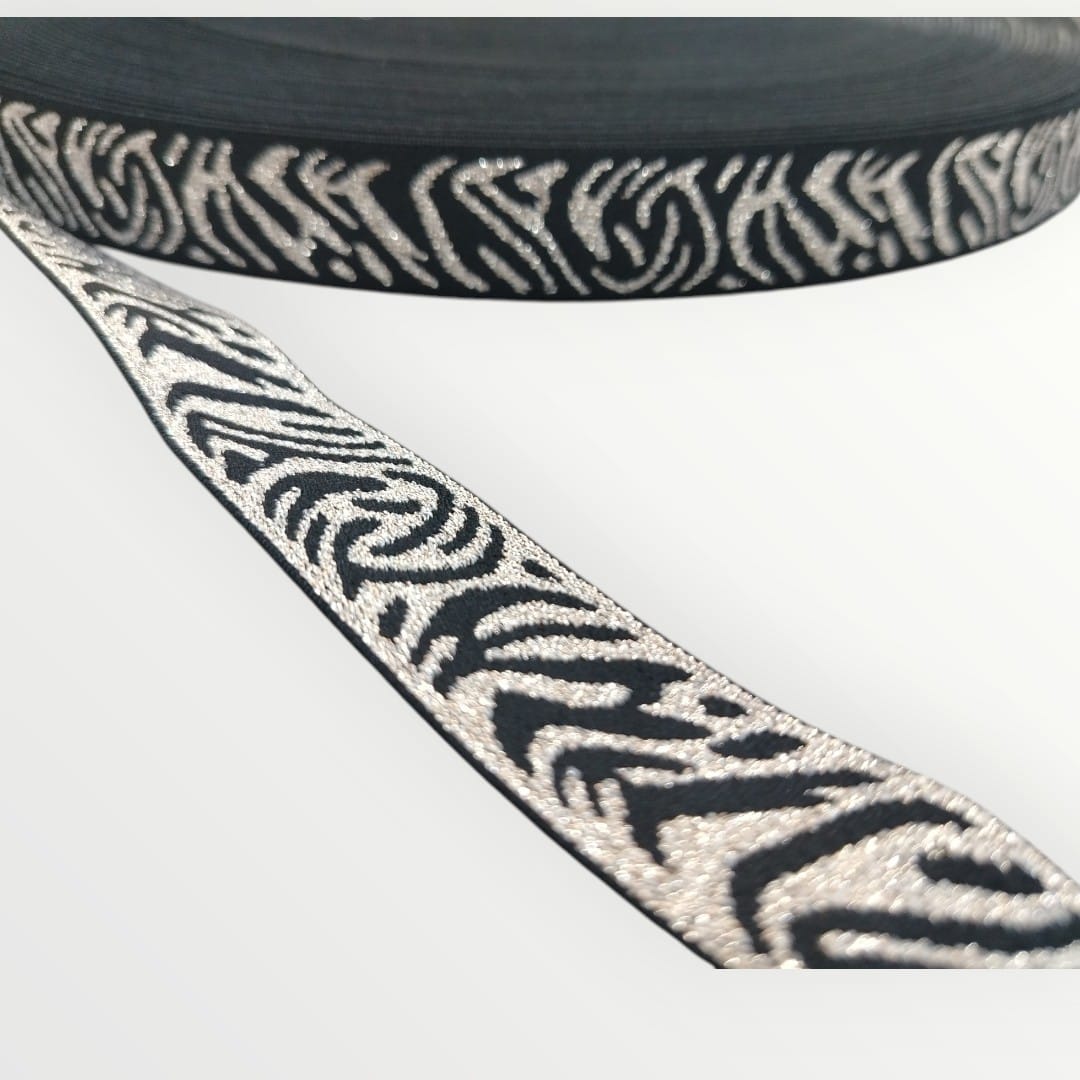 Double your design possibilities with this reversible 25mm fancy elastic that flips between a bold zebra print and a sleek complementary side. The black and gold lurex threading gleams from both angles, giving you maximum versatility for your most audacious creations. Flip it to match your mood—one side commands attention with its wild pattern, while the reverse offers understated sophistication. Perfect for designers who refuse to compromise on style or flexibility. Transform any project with this fearless, two-faced trim that keeps up with your creative ambitions.