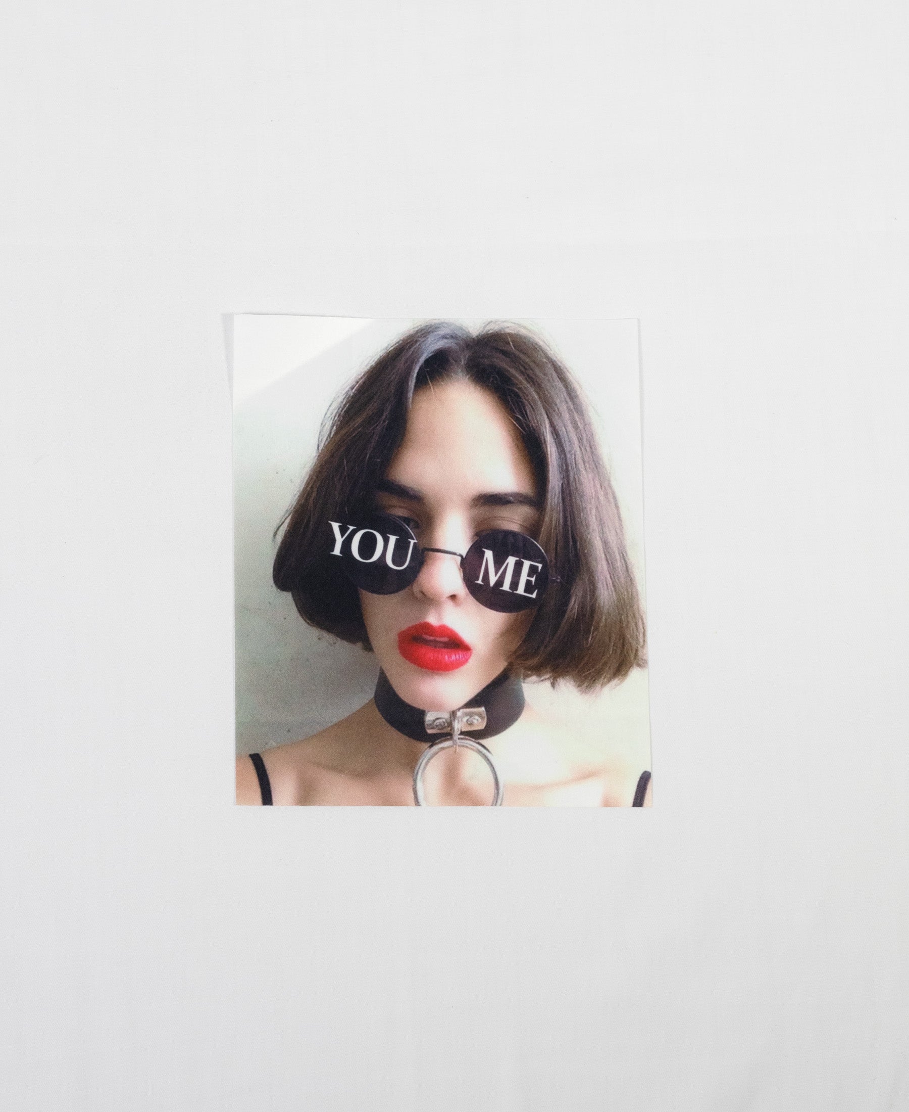 This wonderfully created sew on motif depicts a beautiful brunette woman with red lipstick , a black and silver choker , and black round sunglasses with the words "You" and "Me" on separate frames.